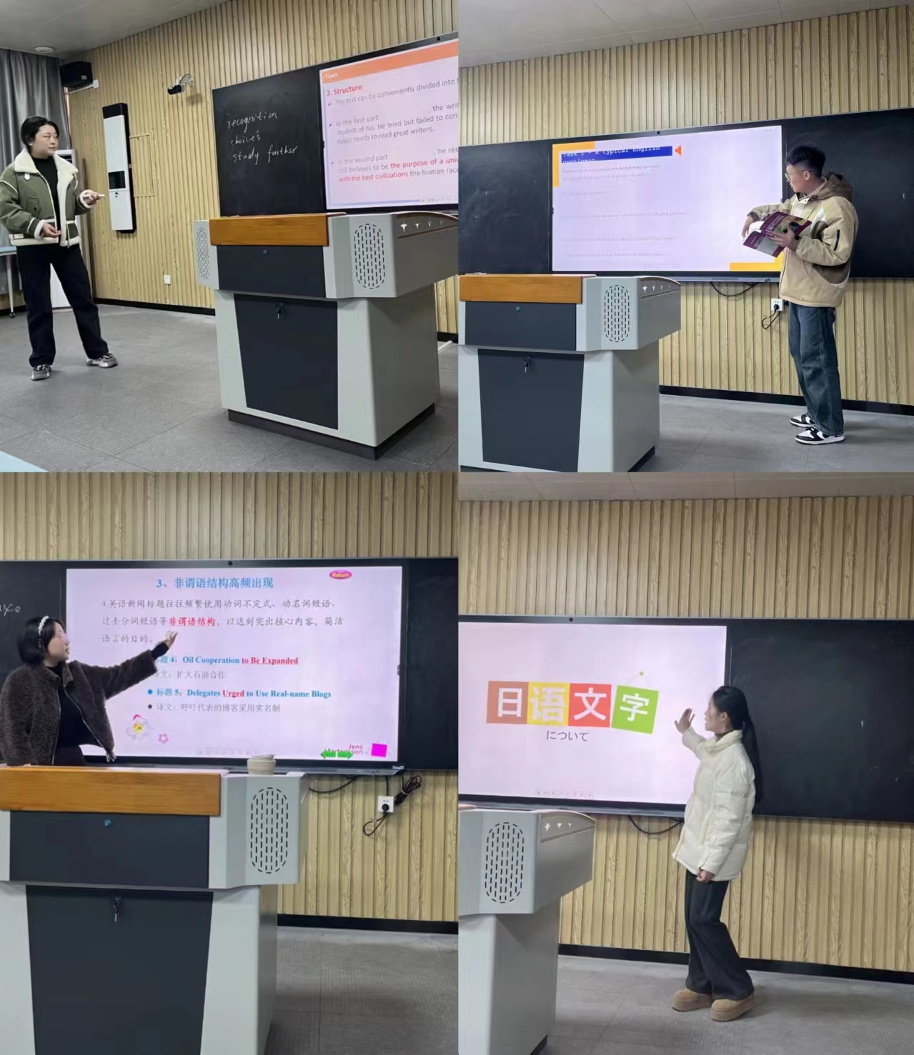 經過精心準備,3名2024年、4名2023年新教師參加了此次試講。他們分別就不同的英語科目進行了認真的展示,內容涵蓋了大學英語、聽力、綜合英語、英美報刊選讀和寫作等。每位新教師都圍繞各自的教學主題,運用多媒體教學工具、互動式教學法和創新教學策略,進行了20分鐘的教學演示。
