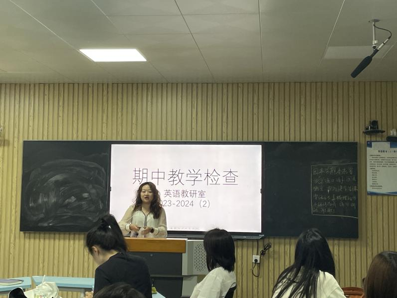 教研室副主任路璐老師從教學檢查中出現(xiàn)的問題、教學質(zhì)量檢查情況統(tǒng)計和教研室討論研究三個環(huán)節(jié)進行匯報。首先,教學過程中遇到的相關問題,如學生、課程、教師、教學條件等方面進行了問題匯總及解決方案建議。其次,對教師的教學質(zhì)量進行量化統(tǒng)計,如教學進度、教案持有、作業(yè)批改、同行聽課及上課情況進行了摸排,為之后的教學進度和教學質(zhì)量的把控做好鋪墊。最后,英語教研室組織全體教師進行了討論研究,分享彼此的教學經(jīng)驗和教學方法,并就存在的問題和困難進行了深入的探討。