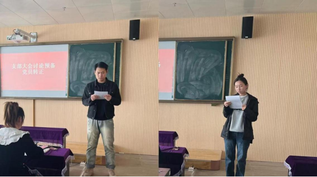 會議第二項,大會嚴格履行黨員轉正程序,由王長劍、魏美玲同志分別宣讀轉正申請,他們表示在預備黨員期間,堅持正確的政治方向,始終在思想上與黨中央保持高度一致。無論是在教學中還是在學習中,都嚴格要求自己,自覺遵守黨的各項規章制度。