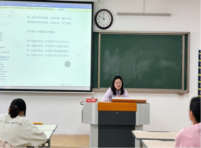 為深化黨性教育,加強紀律建設,進一步提升支部黨員的紀律和規矩意識,yl6809永利官網漢語言文學專業學生第一、第二黨支部于5月8日12時1教307順利開展了“黨紀學習教育主題黨課”,重點對(《中國共產黨廉潔自律準則》和《關于新形勢下黨內政治生活的若干準則》)進行交流與學習。此次活動由黨支部書記張穎穎同志主持,并作專題黨課學習。