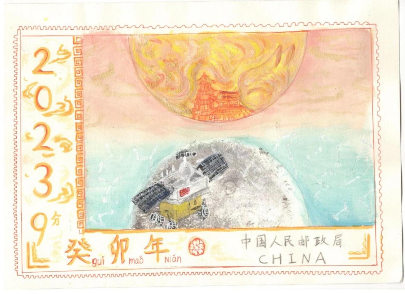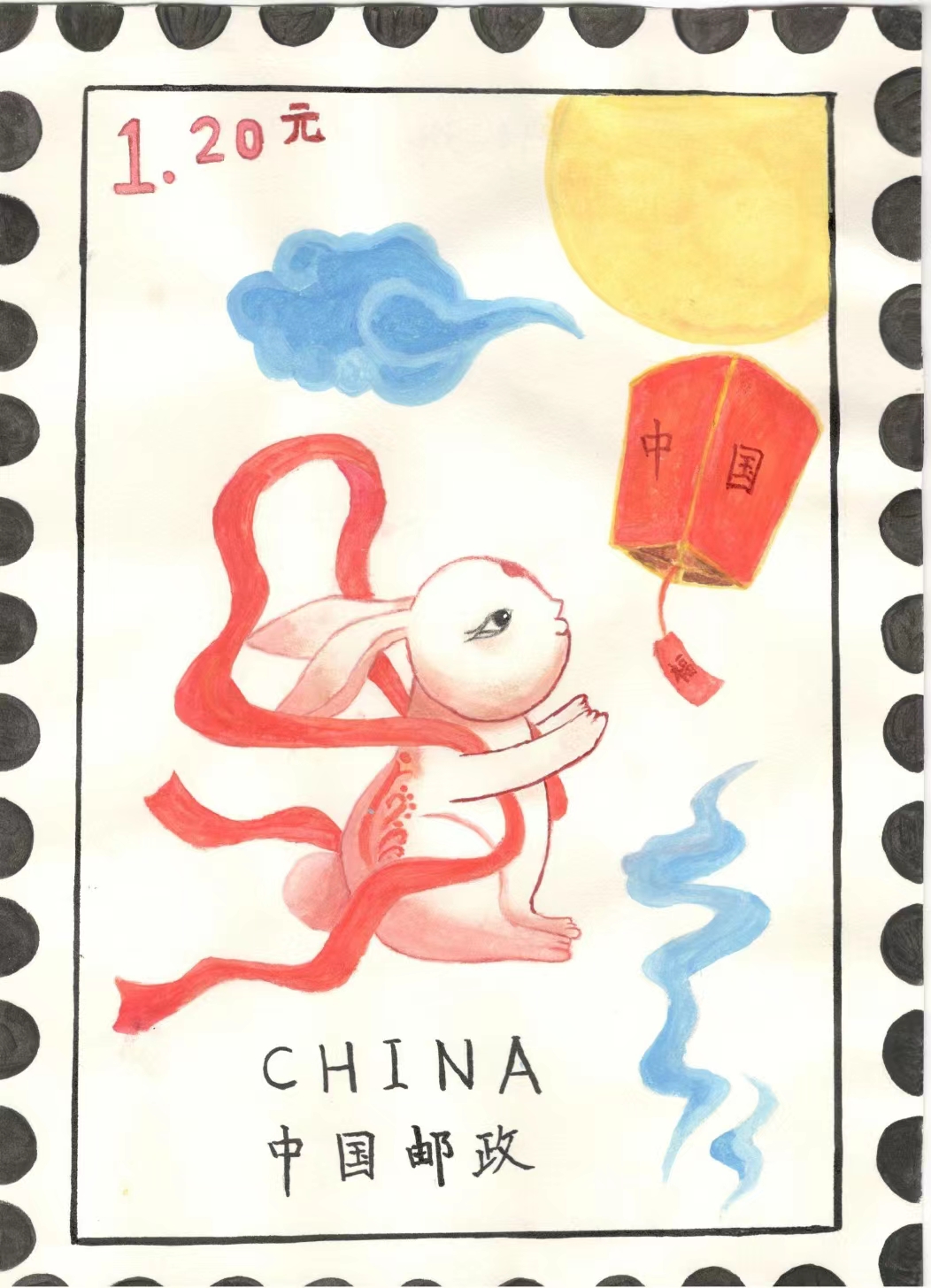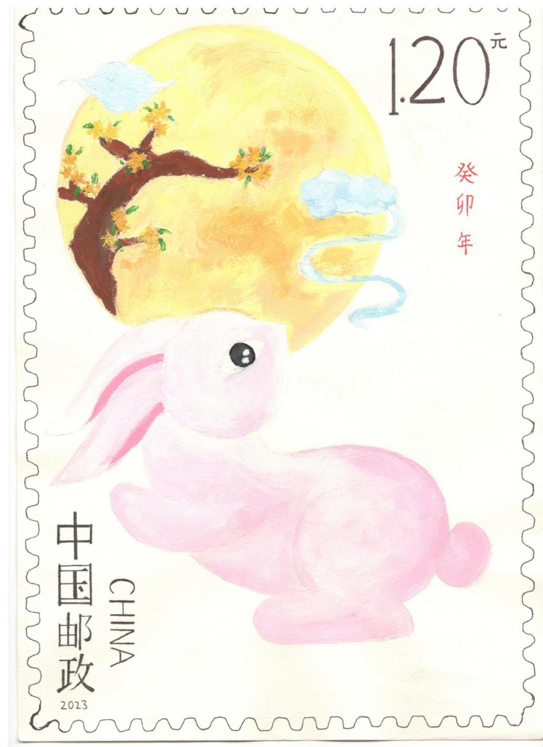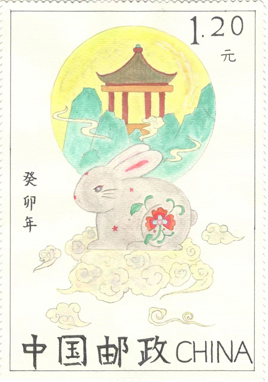 介紹:為了迎接是癸卯年,我設計了該郵票。郵票名為《雙兔送福圖》。一只是紅色剪紙兔子,在月光下輕嗅桂香,有意展現中國傳統神話中的玉兔和桂樹。一只是玉兔號,中國首輛月球車,富有時代氣息。迎春當然少不了福,于是運用中國剪紙制作了祥云福字,再加上齒孔,面值,銘記,就構成了這張郵票。