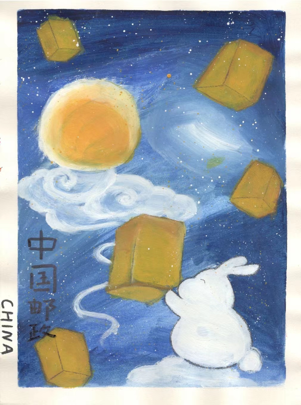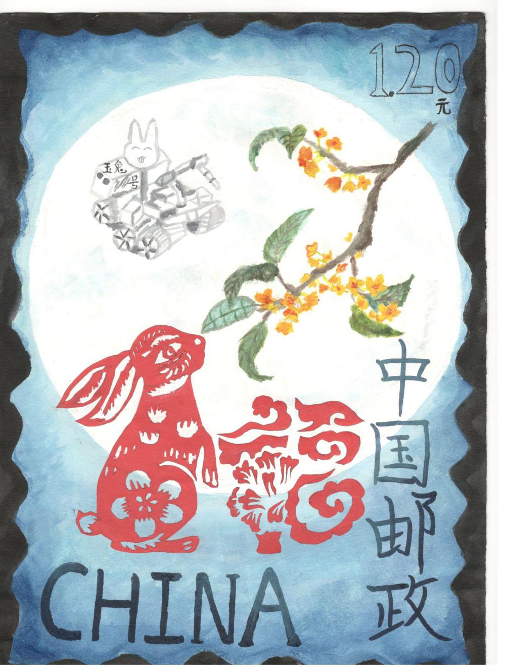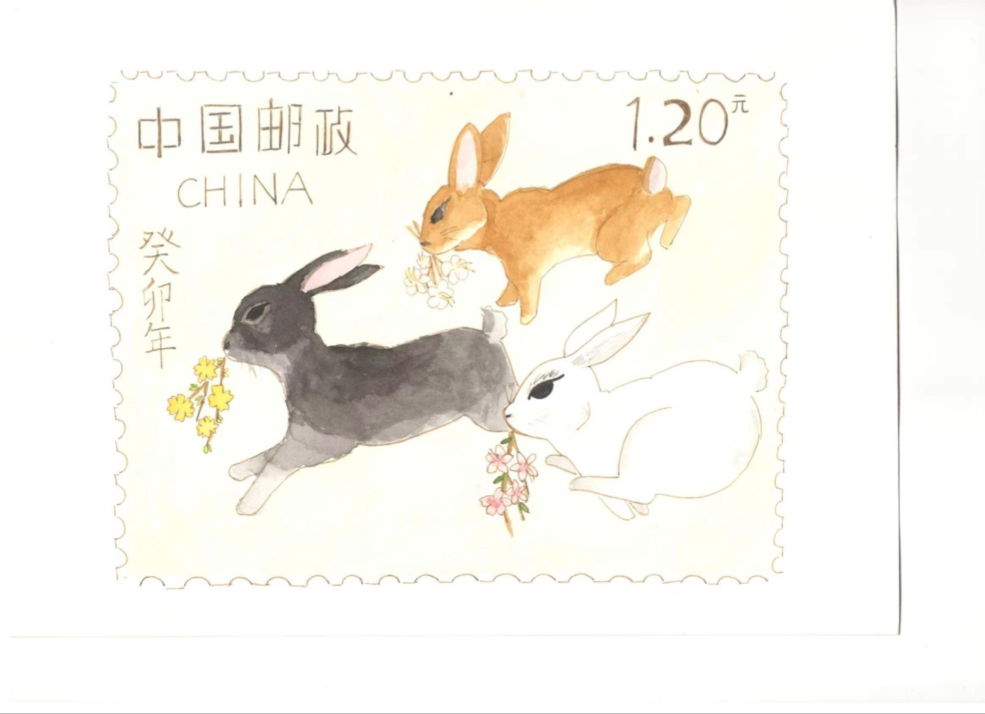 介紹:為了迎接是癸卯年,我設計了該郵票。郵票名為《雙兔送福圖》。一只是紅色剪紙兔子,在月光下輕嗅桂香,有意展現中國傳統神話中的玉兔和桂樹。一只是玉兔號,中國首輛月球車,富有時代氣息。迎春當然少不了福,于是運用中國剪紙制作了祥云福字,再加上齒孔,面值,銘記,就構成了這張郵票。