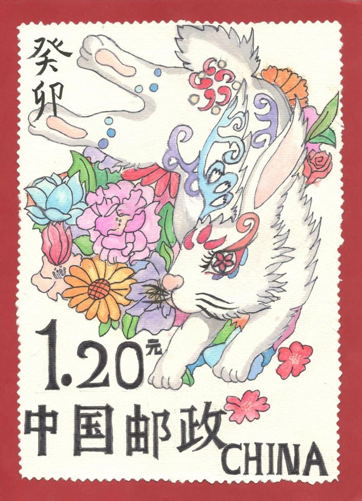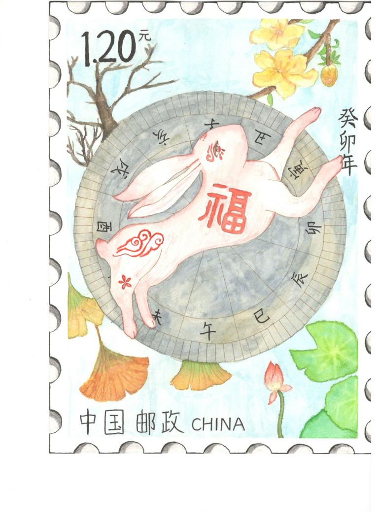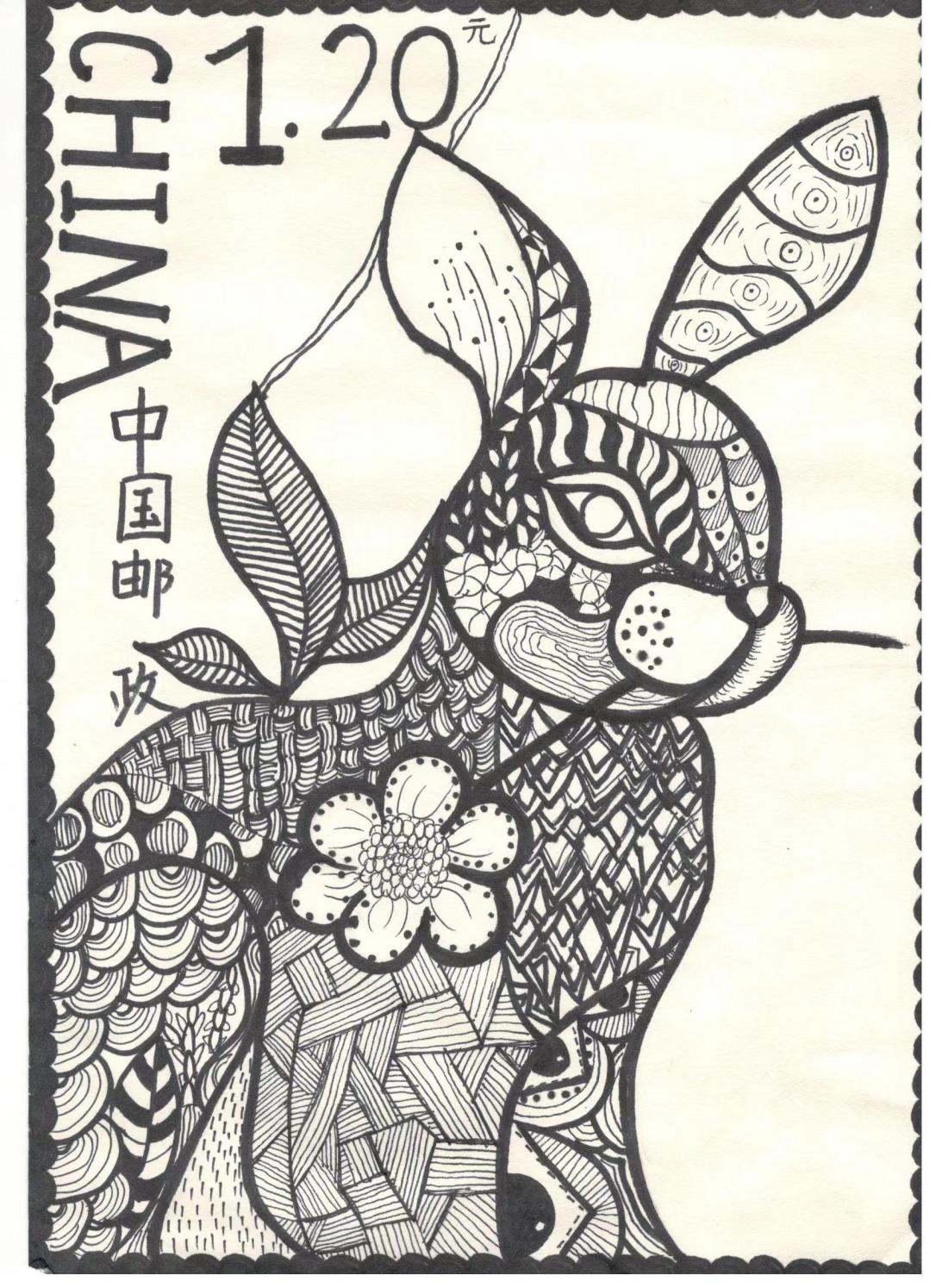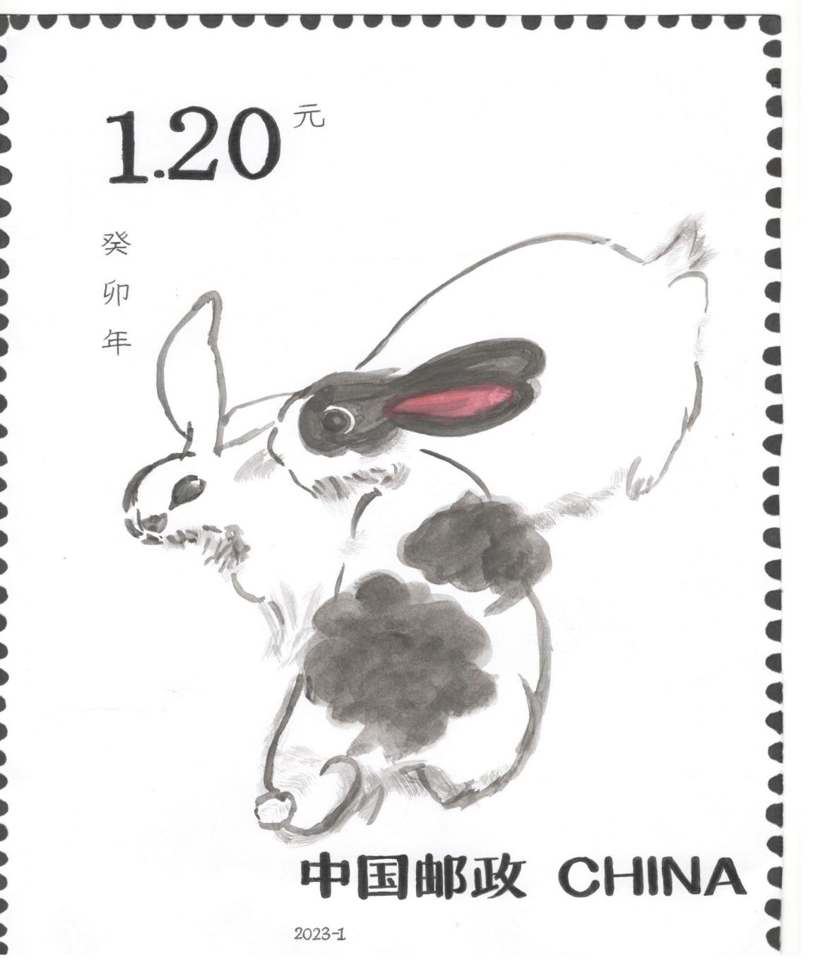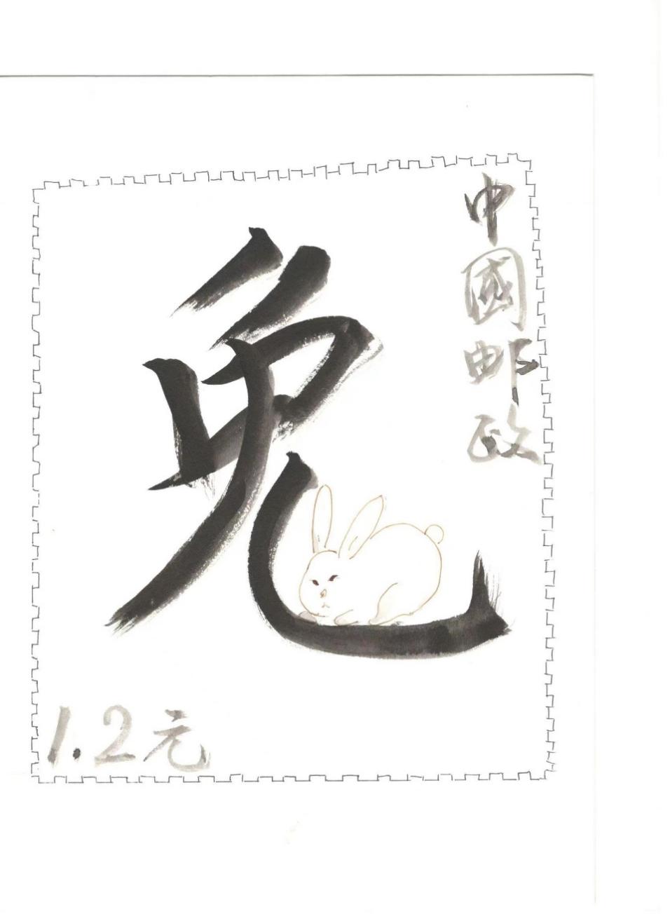 介紹:我的作品是以漢字兔為構想基礎,將繪畫與漢字融合。契合了兔子嬌小的身材特點,將兔字中點化成兔子。同時,郵票設計采用黑白是想符合中國傳統水墨丹青的特色,符合比賽主題。