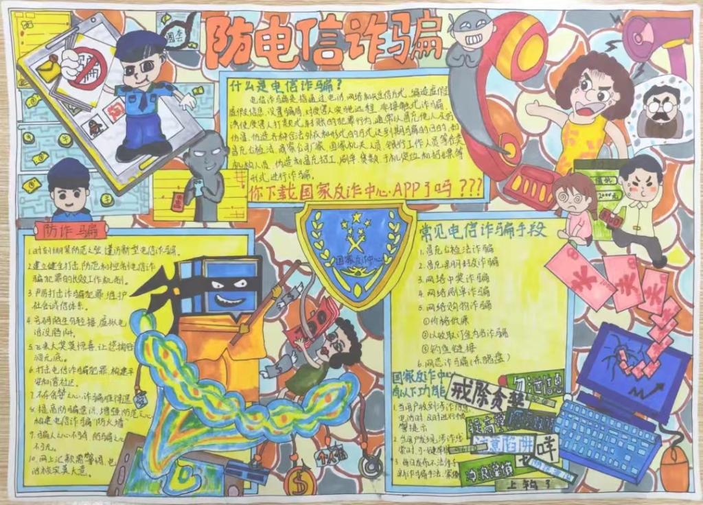 宣傳增強防范之心,畫紙營造反詐氛圍。yl6809永利官網于10月上旬開展“反電詐,防電詐”手抄報活動,我院青年學子積極響應,紛紛投稿,共收到近300件作品。通過團總支微信公眾號投票、評委老師打分等多輪選拔,共遴選出18份獲獎作品,其中一等獎3名,二等獎5名,三等獎10名。21級學前教育1班華蕾蕾的作品以國家反詐中心標志為原型制作手抄報進行知識宣傳,呼吁同學們要做到人人下載安裝國家反詐中心APP。22級漢語言文學4班劉嘉誠的作品則通過順口溜和標語告誡大家要時刻緊繃防范之弦,形式新穎有趣。同學們圍繞反電詐、防電詐等相關知識,以獨特的視角創作出生動形象、寓意深刻的反電詐手抄報,生動再現了網絡詐騙層出不窮的手段及應對方法,有力的喚醒了全院師生反詐騙意識。