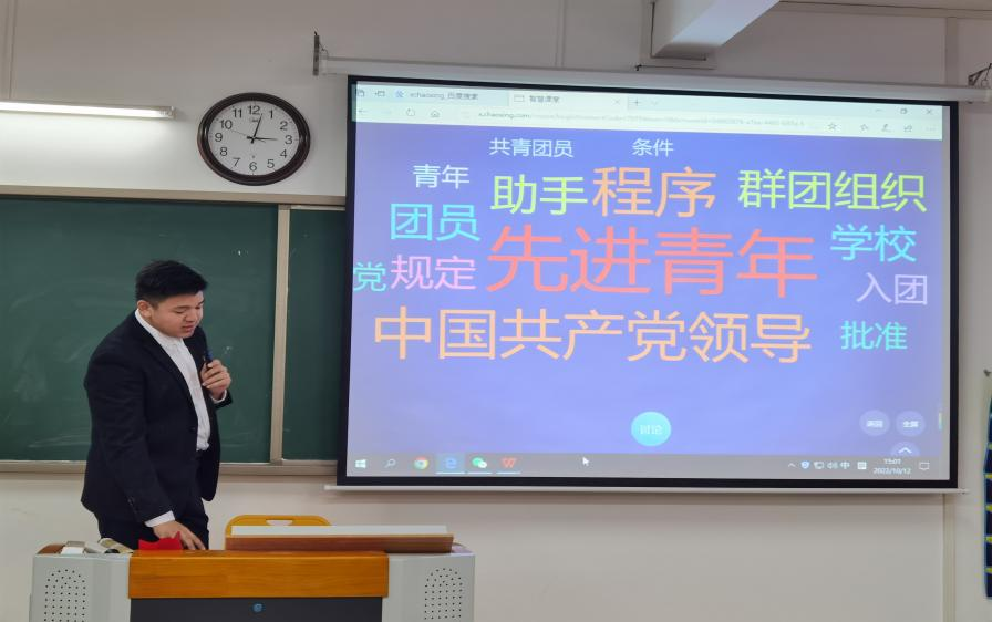 2022級學前教育專升本2班班長劉雙同學進行了主題宣講,與參會團員圍繞“你認為什么是共青團員”、“新時代的共青團員應該是什么樣子?”“在日常生活中共青團員做什么事”等話題展開討論,“團員是黨的助手、黨的后備軍、為人民服務、積極參加志愿服務”等一系列的詞匯涌入大屏幕,同學們都積極表達了自己心中新時代的共青團員形象。最后,通過視頻學習優秀團員的先進事例,參會團員們講述自己參加的志愿活動等事例,給大家分享自己的親身經歷以此鼓勵帶動更多的人加入共產主義青年團這個集體中來。