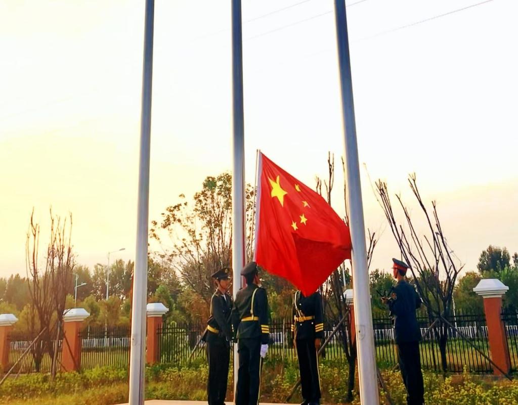 升旗方陣整裝待發(fā),動(dòng)作整齊劃一,踏步剛勁有力。伴隨著《義勇軍進(jìn)行曲》,升旗隊(duì)員邁著鏗鏘有力、整齊劃一的步伐向著升旗臺(tái)進(jìn)發(fā),以最莊嚴(yán)的姿態(tài)面對(duì)國(guó)旗,全體師生注視著五星紅旗冉冉升起。