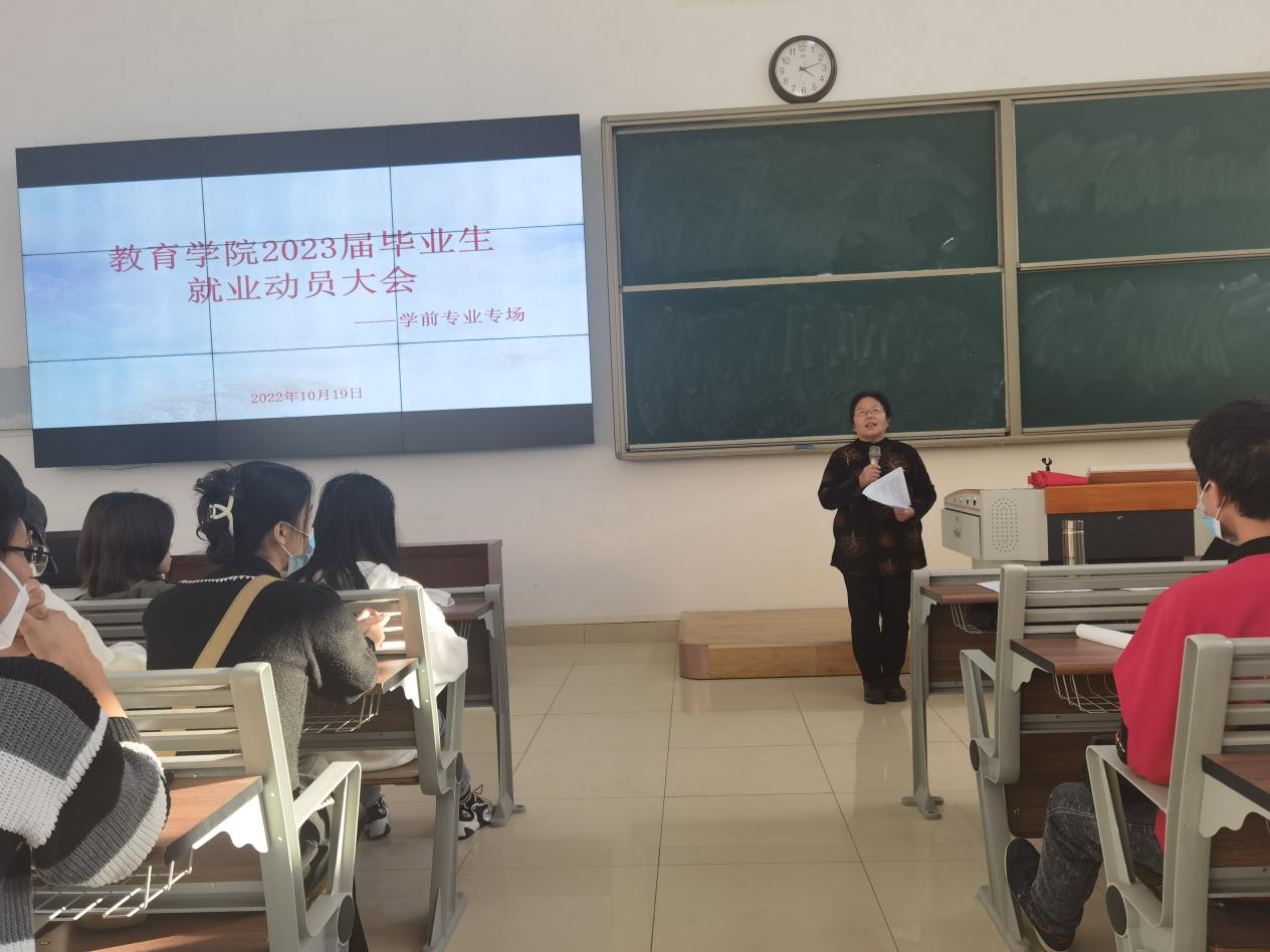 2022年10月19日下午,我院在教學樓121教室召開2023屆畢業生就業動員大會。為幫助2023屆畢業生準確有效地確定就業方向,盡快地讓同學們在思想、行動上早做準備,指導畢業生如何走好從大學走向社會的重要一步。yl6809永利官網王家云院長、孟向紅副書記及學前教研組老師出席本次會議,2023屆yl6809永利官網學前教育專業全體畢業生參加會議。會議分兩場進行,分別由yl6809永利官網學前教育專業輔導員任若晨、侯莉萍主持。