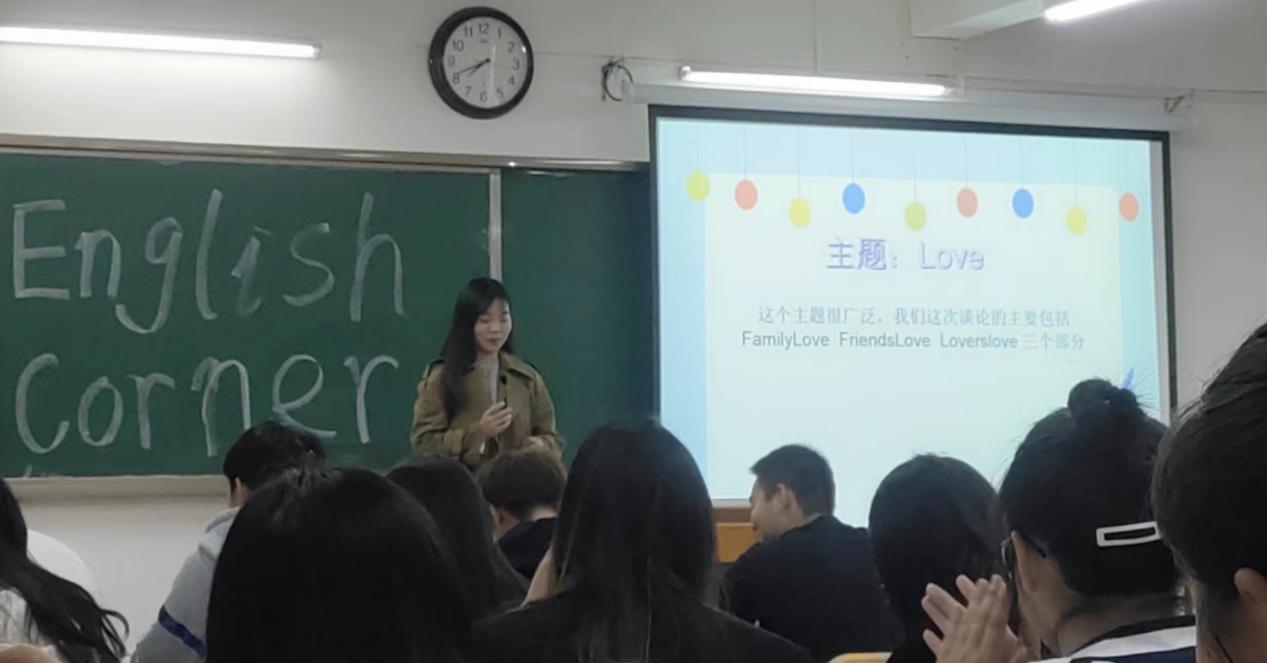 活動開始,主持人曹子義同學發言,引入本次英語角的主題“Love”,主持人也給大家共享了他的想法。接著,張瑩瑩同學以一首英文歌曲“Love story”大大提高了同學們的熱情,為全場營造了一種活躍熱鬧的氛圍,鼓勵了更多的同學積極展現自己。隨后又進行了“單詞接龍”和“你說我猜”英語游戲競賽。整場活動持續一個半小時,整個過程中,大家都沉浸在輕松和諧的氣氛里。同學們不但討論了這次的主題,談到了如何讓英語專業的活動變得更有意義,也討論到他們各自感興趣的話題。