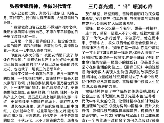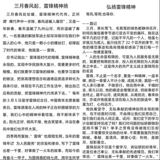 本次征文寫作比賽共收取作品455份,有140名同學獲獎。其中,黃佩佩等20名同學獲得一等獎,王夢等30名同學獲得二等獎,陳玉兒等40名同學獲得三等獎,陳婷婷等50名同學獲得優秀獎。參賽同學的作品闡明了學習雷鋒精神的昂揚熱情和奮發自覺性。