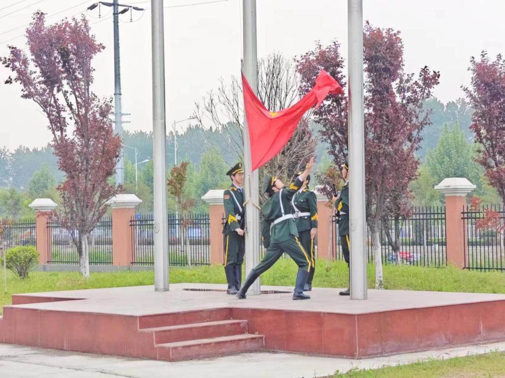 國旗護衛隊邁著整齊的步伐,護送著國旗向升旗臺緩緩走去,伴隨著雄渾有力的國歌響起,五星紅旗冉冉升起,全體師生莊嚴肅立,對五星紅旗行注目禮。