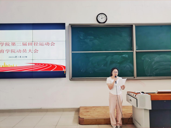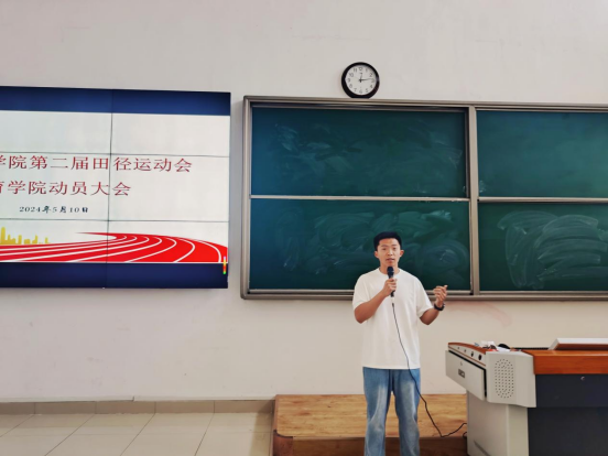 高偉老師詳細介紹了本次運動會的比賽項目、比賽規則、比賽要領及注意事項,希望運動健兒們發揚團隊精神,牢記安全意識安全、刻苦訓練。高偉老師還介紹了我院上一屆運動會的獲獎情況,鼓勵運動員們以最飽滿的狀態向更優秀的成績發起沖擊,他希望大家抓緊利用課余時間科學訓練,在即將召開的運動會上取得更好的成績。