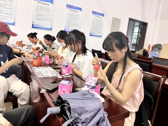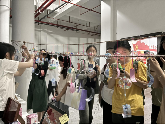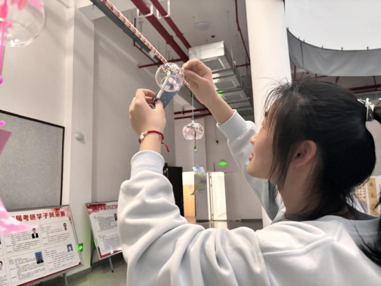 在創作過程中,同學們相互合作,友好交流,分享自己的作品。大家沉浸在輕松舒適的氛圍中,用風鈴實現自我表達和情感抒發,達到了心理減壓的良好效果。最后,同學們將自己的作品掛在藝術樓一樓大廳進行展示。