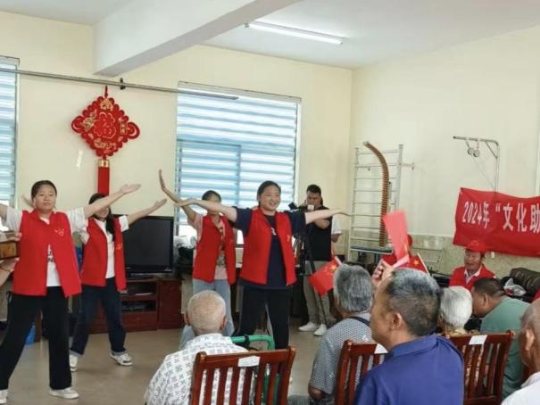 接著,志愿者們為老人們呈現了一場精彩的文藝表演,將現場氣氛推向了高潮。老人們在座位上揮舞著小紅旗,歡聲笑語不斷,共同欣賞這美妙的演出,大家都沉浸在歡樂之中。