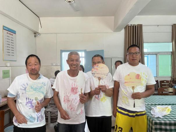 文藝表演結束后,志愿者們又帶領老人們開展了“DIYT體恤”和漆扇活動。在老人們的熱切期待下,志愿者們耐心指導他們如何根據自己的喜好設計體恤,并在扇面上繪制出獨特的圖案。在老人們的巧手和志愿者的協助下,每個人都創作出了自己滿意的作品,臉上洋溢著自豪和喜悅的笑容。這些活動不僅豐富了老人們的日常生活,還讓他們感受到了創造的樂趣和成就感。