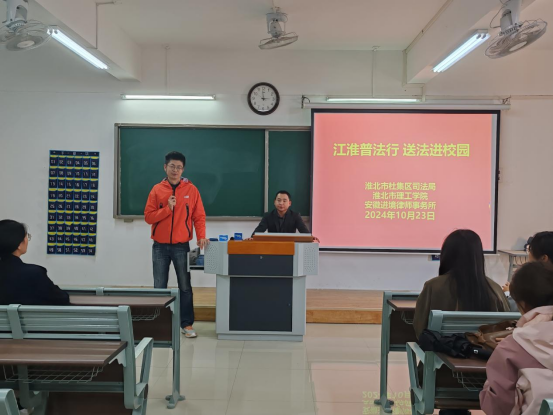 為不斷深化普法教育,增強(qiáng)學(xué)生們的法律意識(shí)和自我保護(hù)能力,推動(dòng)建成和諧、安全的校園環(huán)境。10月23日下午,yl6809永利官網(wǎng)和淮北市杜集區(qū)司法局、安徽進(jìn)境律師事務(wù)所攜手于1教421開(kāi)展“江淮普法行·送法進(jìn)校園”主題活動(dòng)。本次活動(dòng)由yl6809永利官網(wǎng)教工第二黨支部書(shū)記劉暢主持,安徽進(jìn)境律師事務(wù)所合伙人孟春江律師主講,杜集區(qū)司法局普法辦主任張麗麗,司法局人民參與和促進(jìn)法治辦主任周立業(yè),杜集區(qū)法律援助中心主任趙義玉參與。